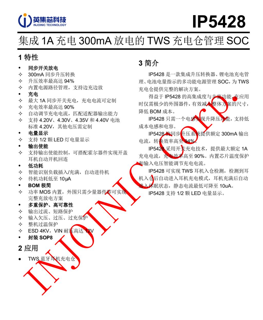 IP5428&IP5427 是集成 1A 充電、300mA 放電的 TWS 充電倉(cāng)管理 SOC,集成升壓轉(zhuǎn)換器、鋰電池充電管理、電池電量指示的多功能電源管理 SOC,為 TWS 充電倉(cāng)提供完整的解決方案。