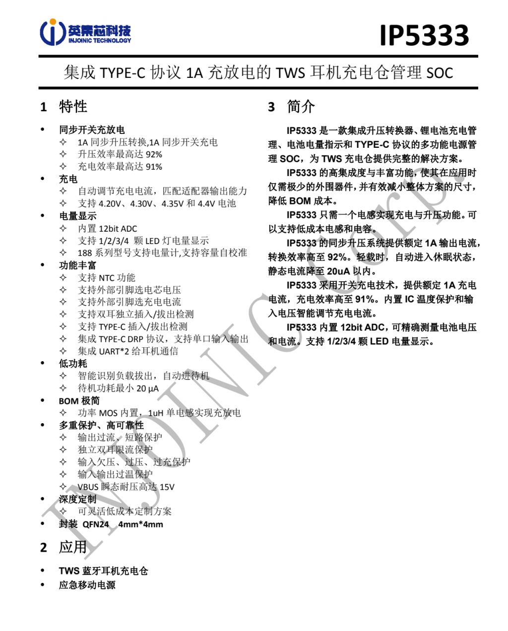 深圳英集芯科技股份有限公司成立于 2014 年,是一家專注于高性能、高品質(zhì)數(shù)?;旌闲酒O(shè)計(jì)公司,主營(yíng)業(yè)務(wù)為電源管理芯片、快充協(xié)議芯片的研發(fā)和銷售,提供的電源管理芯片和快充協(xié)議芯片廣泛應(yīng)用于移動(dòng)電源、快充電源適配器、無(wú)線充電器、車載充電器、TWS 耳機(jī)充電倉(cāng)等產(chǎn)品。