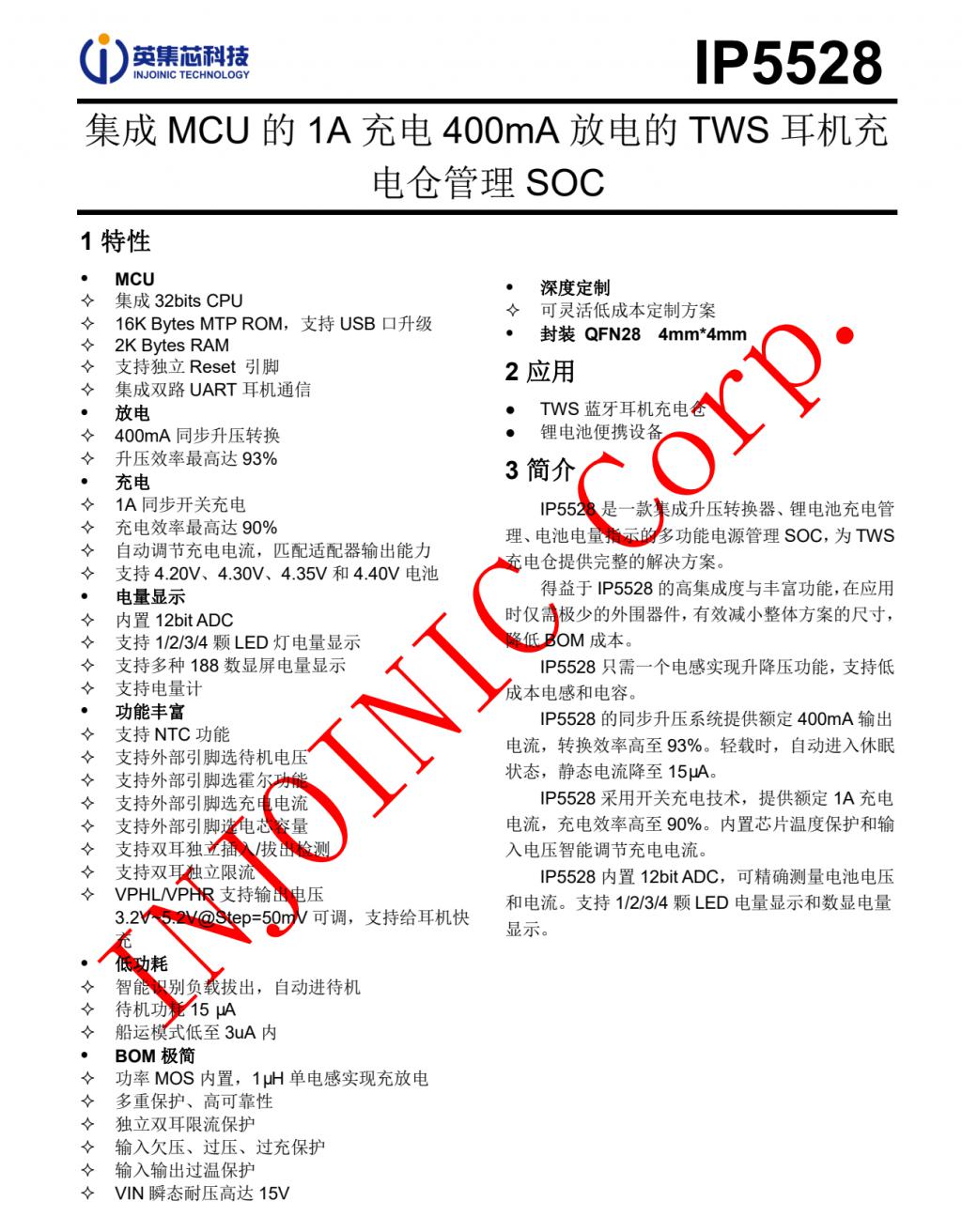IP5528是一款集成 MCU 的 1A 充電 400mA 放電的 TWS 耳機(jī)充電倉(cāng)管理 SOC,集成升壓轉(zhuǎn)換器、鋰電池充電管理、電池電量指示的多功能,為 TWS 充電倉(cāng)提供完整的解決方案。