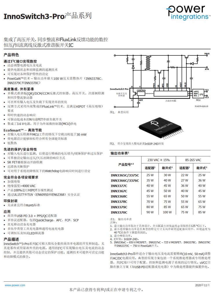 此次方案介紹選取的PI電源芯片型號(hào)為 INN3367C,作為 InnoSwitch3-Pro 芯片家族的一員,INN3367C 可極大簡(jiǎn)化全數(shù)控高效率電源的開(kāi)發(fā)和制造,尤其是那些采用緊湊外殼的電源。通用的I2C可實(shí)現(xiàn)輸出電壓及電流的動(dòng)態(tài)控制,并且提供其他可動(dòng)態(tài)設(shè)定的保護(hù)功能。遙測(cè)技術(shù)可提供可設(shè)定功能和故障模式的報(bào)告。