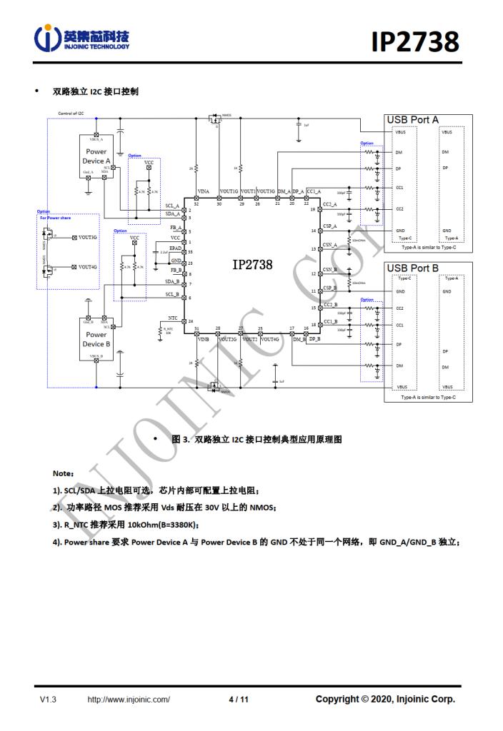 此款方案使用兩路PI的高集成電源芯片,和一顆IP2738實(shí)現(xiàn)雙口同插智能分配功率,且兩個(gè)C口同時(shí)支持快充功能。方案支持 PD2.0/3.0(PPS)、QC2/QC3、AFC、FCP、SCP、MTK PE+ 等協(xié)議輸出。IP2738 采用MTP架構(gòu)設(shè)計(jì),可根據(jù)不同客戶需求配置不同的功率分配以及其它拓展功能。