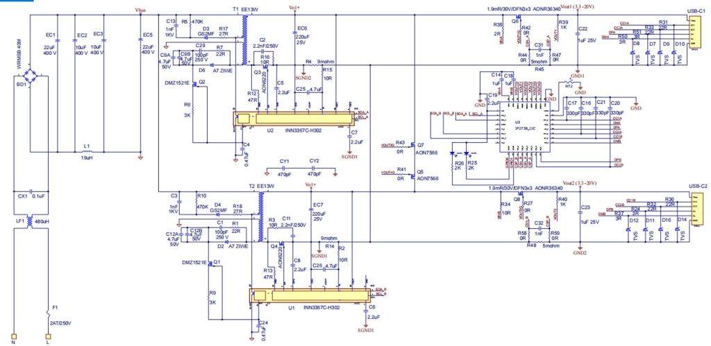 和PI電源芯片搭配的是英集芯 IP2738雙路協(xié)議芯片,兩個(gè)接口輸出均由IP2738控制。英集芯 IP2738 采用QFN32封裝,體積小巧,外圍精簡(jiǎn),可簡(jiǎn)化充電器的協(xié)議電路設(shè)計(jì)。支持雙口18-140W快充應(yīng)用,具備獨(dú)立的反饋控制和獨(dú)立的USB PD控制。芯片IO引腳支持PFC控制,實(shí)現(xiàn)更低的待機(jī)功耗。