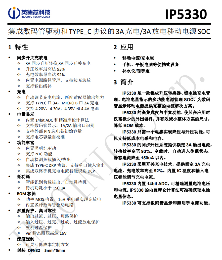 上圖為Injoinic英集芯IP5330多功能電源管理SoC,是一款集成數(shù)碼管驅(qū)動和TYPE-C協(xié)議的3A充電/3A放電移動電源SoC,集升壓轉(zhuǎn)換器、鋰電池充電管理、電池電量指示等多重功能為一體,支持4.2V,4.3V,4.35V和4.4V電池應(yīng)用,支持NTC溫度保護,具備完善的保護功能。