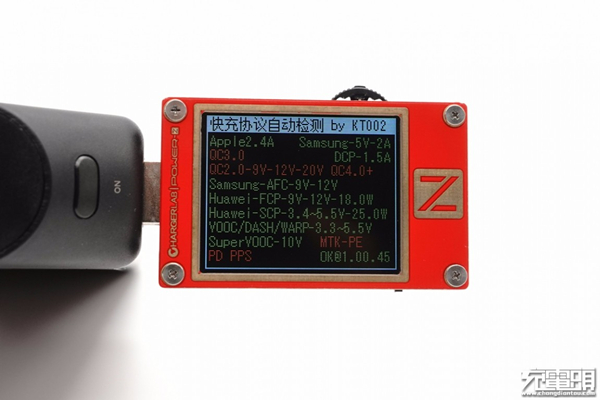 移動電源模式下,使用ChargerLAB POWER-Z KT002檢測USB-A口輸出協(xié)議,顯示支持Apple 2.4A、Samsung 5V2A、DCP協(xié)議,以及AFC、FCP、SCP、VOOC/DASH/WARP、SuperVOOC多個快充協(xié)議。