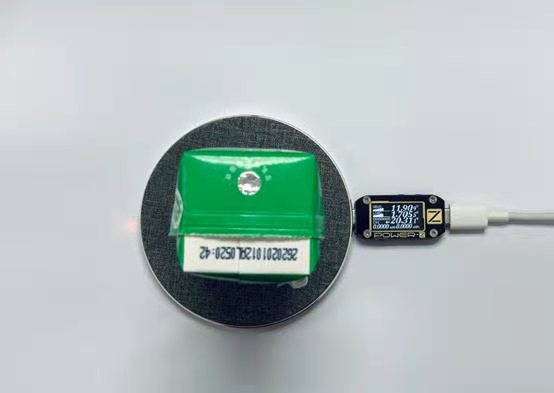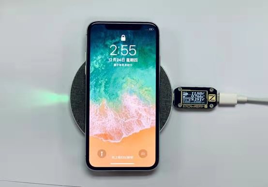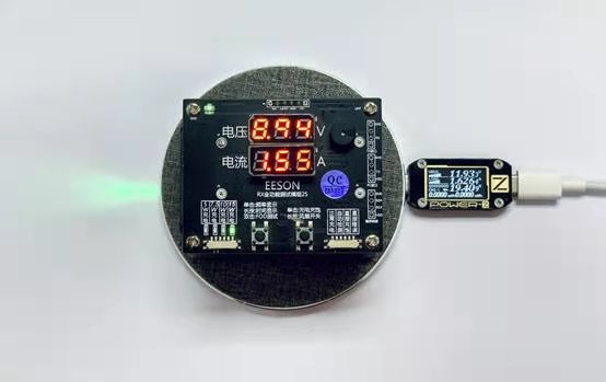 用測(cè)試架顯示:輸出電壓8.94V,電流1.55A,實(shí)際接近15W無線充輸出