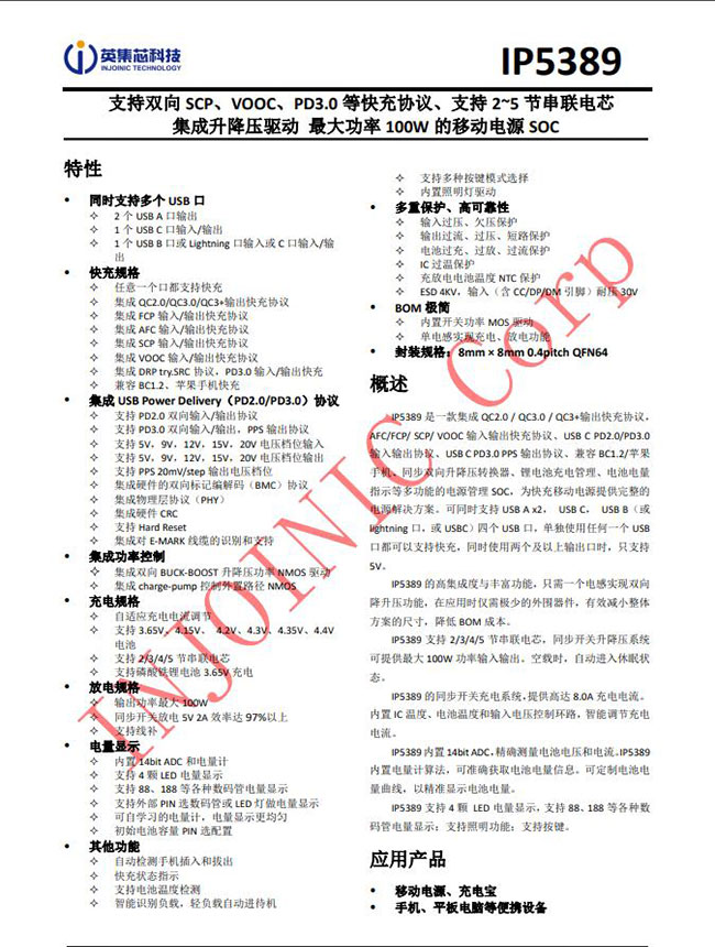 IP5389是一款集成QC2.0 / QC3.0 / QC3+輸出快充協(xié)議、AFC/FCP/ SCP/ VOOC 輸入輸出快充協(xié)議、USB C PD2.0/PD3.0、輸入輸出協(xié)議、USB C PD3.0 PPS 輸出協(xié)議、兼容 BC1.2/蘋果手機(jī)、同步雙向升降壓轉(zhuǎn)換器、鋰電池充電管理、電池電量指示等多功能的電源管理SOC,為快充移動電源提供完整的電源解決方案。同時(shí)IP5389支持USB A x2、USB C、USB B(或lightning 口,或 USBC)四個(gè)USB 口,單獨(dú)使用任何一個(gè)USB口都可以支持快充,同時(shí)使用兩個(gè)及以上輸出口時(shí)只支持5V。