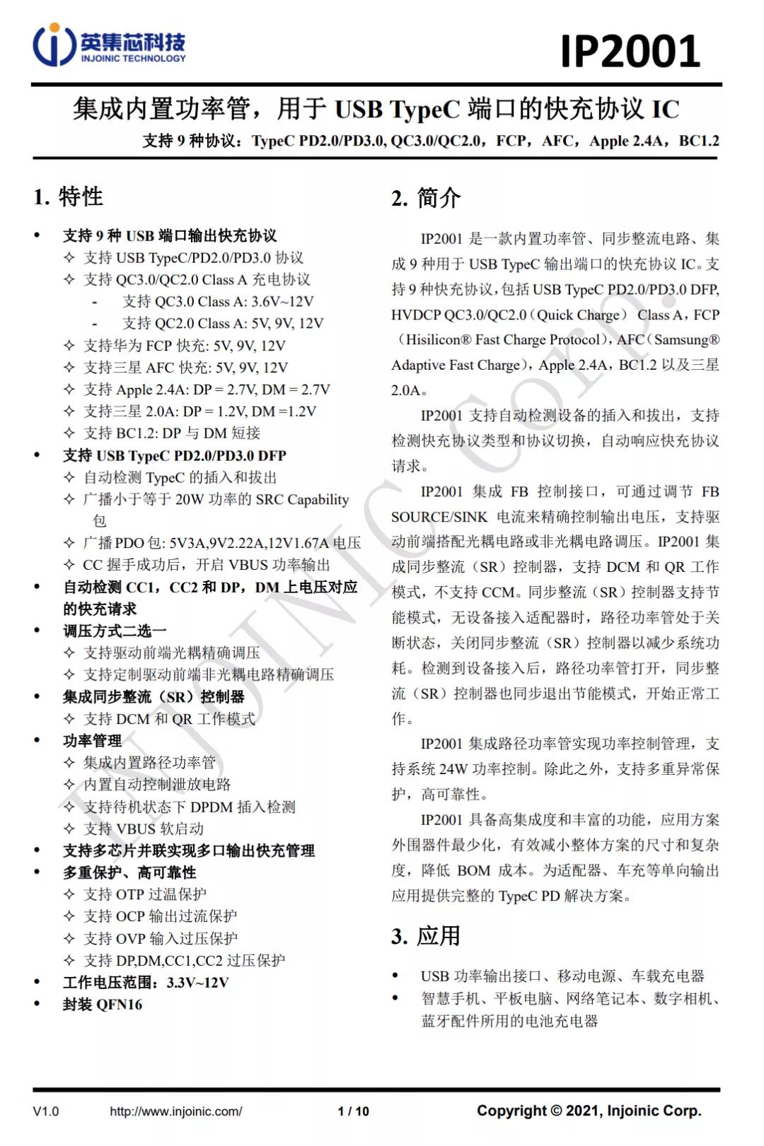 小功率PD快充的高集成度協(xié)議芯片IP2001