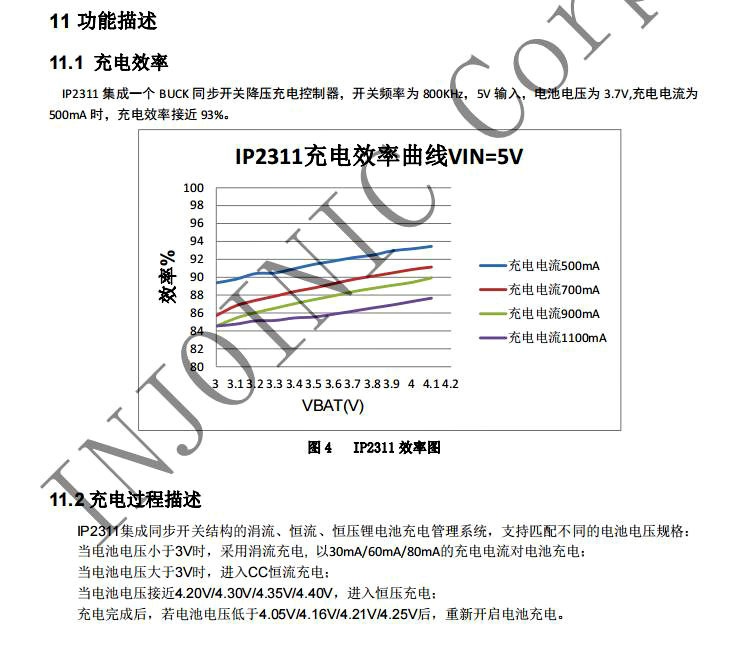 IP2311的同步開(kāi)關(guān)降壓充電轉(zhuǎn)換器工作頻率為800KHz;5V輸入,電池電壓為3.7V,充電電流為500mA時(shí),轉(zhuǎn)換效率為93%。IP2311 輸入電壓為5V,輸入可以自動(dòng)調(diào)節(jié)充電電流,匹配適配器負(fù)載能力。
