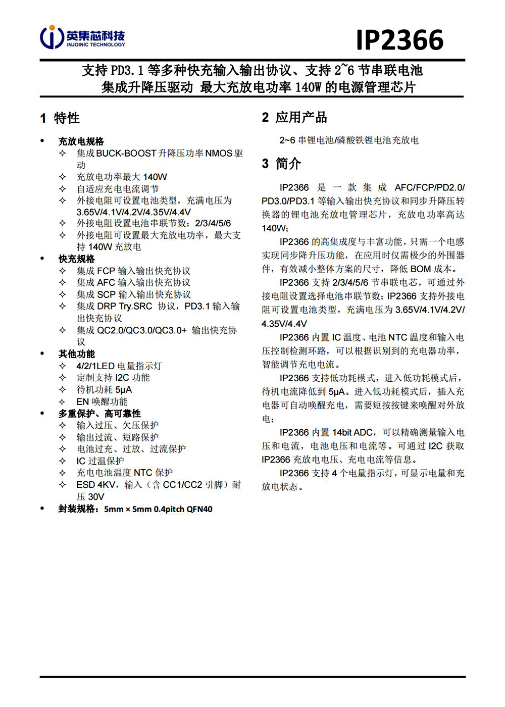 英集芯IP2366:集成快充輸出140W超大功率儲(chǔ)能電源解決方案芯片