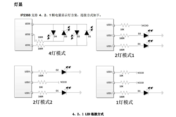 英集芯IP2368支持4、2、1顆電量顯示燈方案,可以定制其他燈顯或188數(shù)碼管方案。