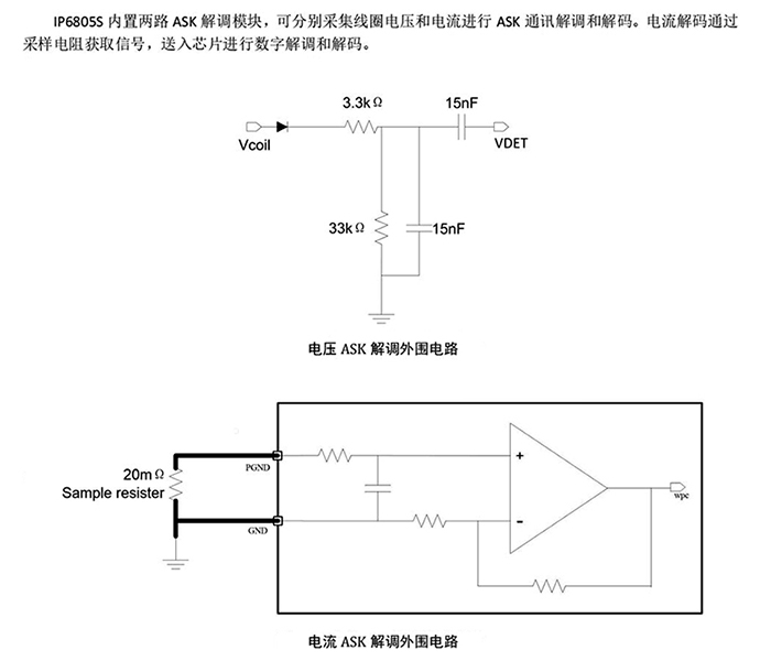 IP6805S 內(nèi)置兩路 ASK 解調(diào)模塊,可分別采集線圈電壓和電流進(jìn)行 ASK 通訊解調(diào)和解碼。電流解碼通過采樣電阻獲取信號,送入芯片進(jìn)行數(shù)字解調(diào)和解碼。IP6805S支持最多2路 LED 燈顯,還能顯示各種充電狀態(tài)指示,用戶可以清晰地了解設(shè)備的充電狀態(tài)。