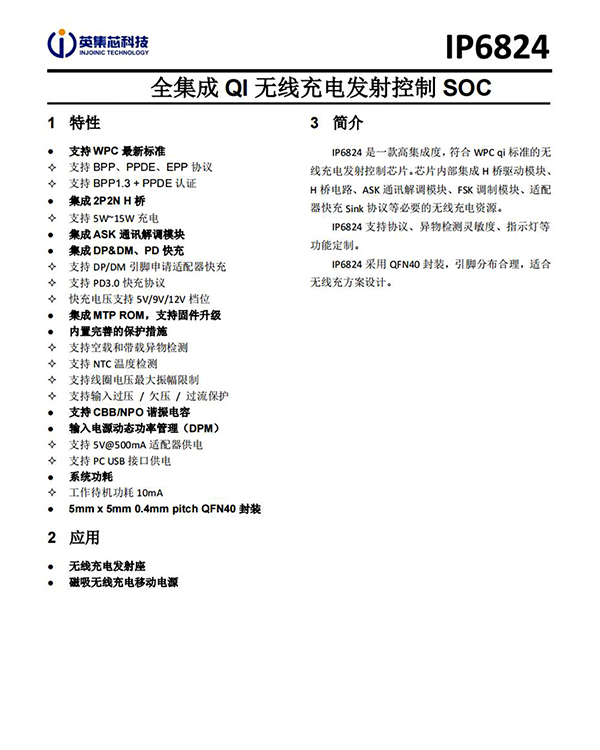 英集芯IP6824:支持QI標(biāo)準(zhǔn)的高集成無線充電發(fā)射控制SOC芯片