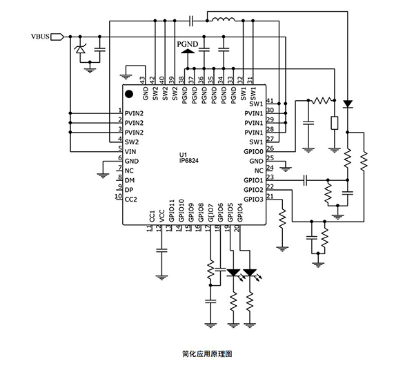 此外,IP6824內(nèi)置了USB PD協(xié)議,可以通過CC1,CC2引腳向PD適配器申請(qǐng)電壓,內(nèi)置的DP/DM類適配器快充協(xié)議,通過DP和DM引腳可以向適配器申請(qǐng)電壓。