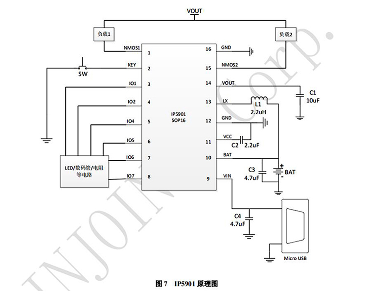 IP5901內(nèi)置兼容8051指令集的8位MCU,主頻時(shí)鐘最高可達(dá)到12MHz。它還內(nèi)置了256字節(jié)的RAM和2K字節(jié)的OTP ROM,為便攜電子設(shè)備提供充足的編程空間。