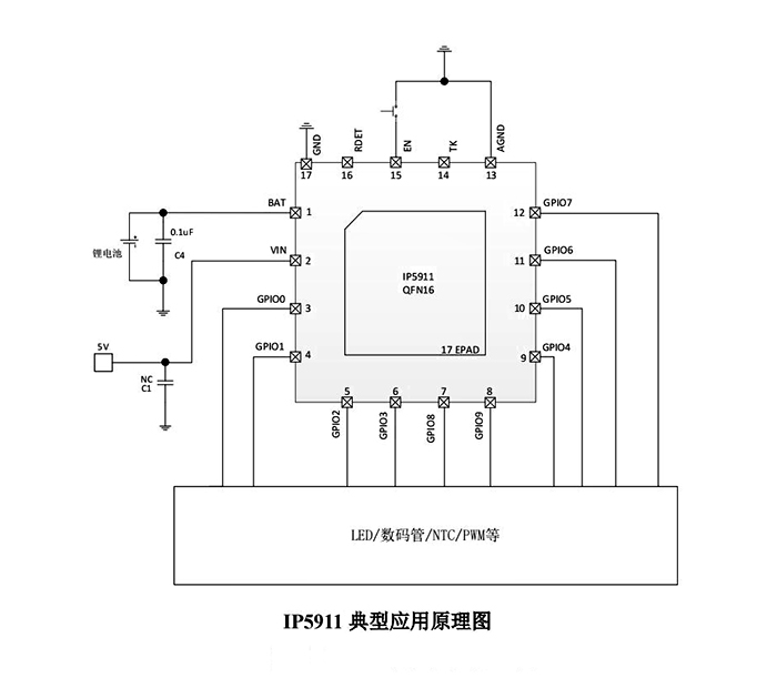 IP5911芯片還支持10個GPIO口功能,其中IO4、IO5、IO6、IO7具有強大的30mA大電流驅(qū)動能力,能夠滿足對電流需求較大的設備的需求。其他的IO口支持20mA的驅(qū)動能力,足以滿足一般設備的需求。這一設計靈活多樣,可以滿足不同設備對電流需求的不同情況,為用戶提供了更多的選擇空間。