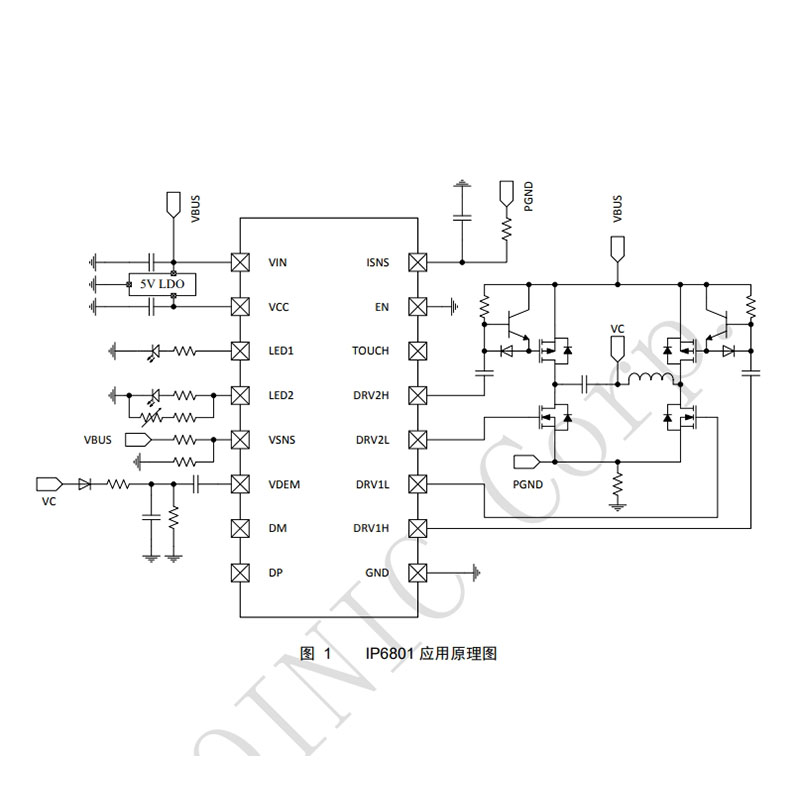 芯片支持DP&DM接口申請(qǐng)5V/9V/12V電壓,可智能識(shí)別適配器輸出能力,動(dòng)態(tài)調(diào)整充電模式。例如,當(dāng)適配器支持12V輸出時(shí),IP6801可切換至15W快充模式;若僅支持5V輸出,則自動(dòng)調(diào)整為5W模式,確保充電穩(wěn)定。